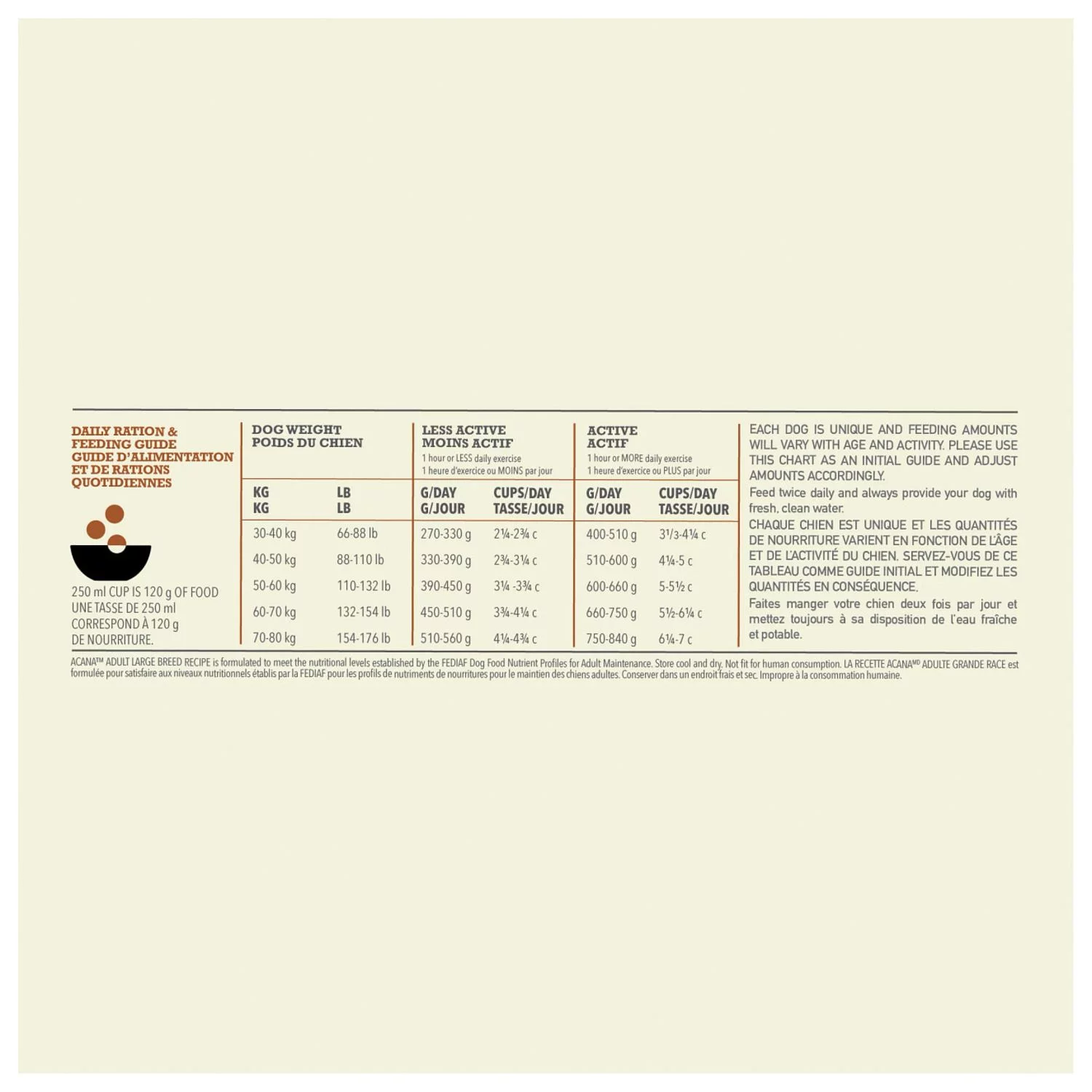 De voeding van ACANA is volgens het Biologically Appropriate-principe bereid en zit vol waardevolle voedingsstoffen voor een perfecte voeding van honden van alle rassen en leeftijden. ACANA Adult Large Breed bestaat uit 60% dierlijke ingrediënten en 40% plantaardige ingrediënten. We maken gebruik van glutenvrije haver voor een gelijkmatige energieafgifte.