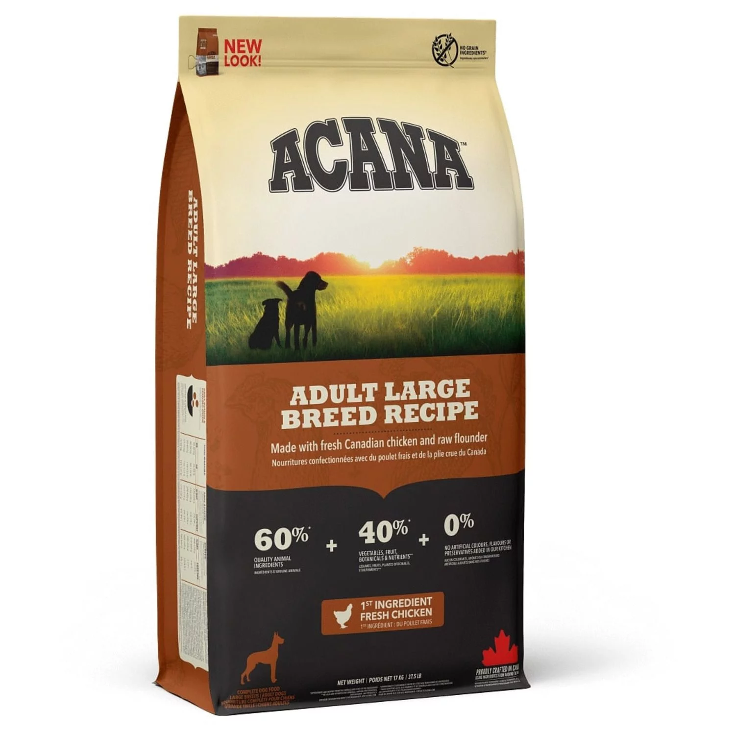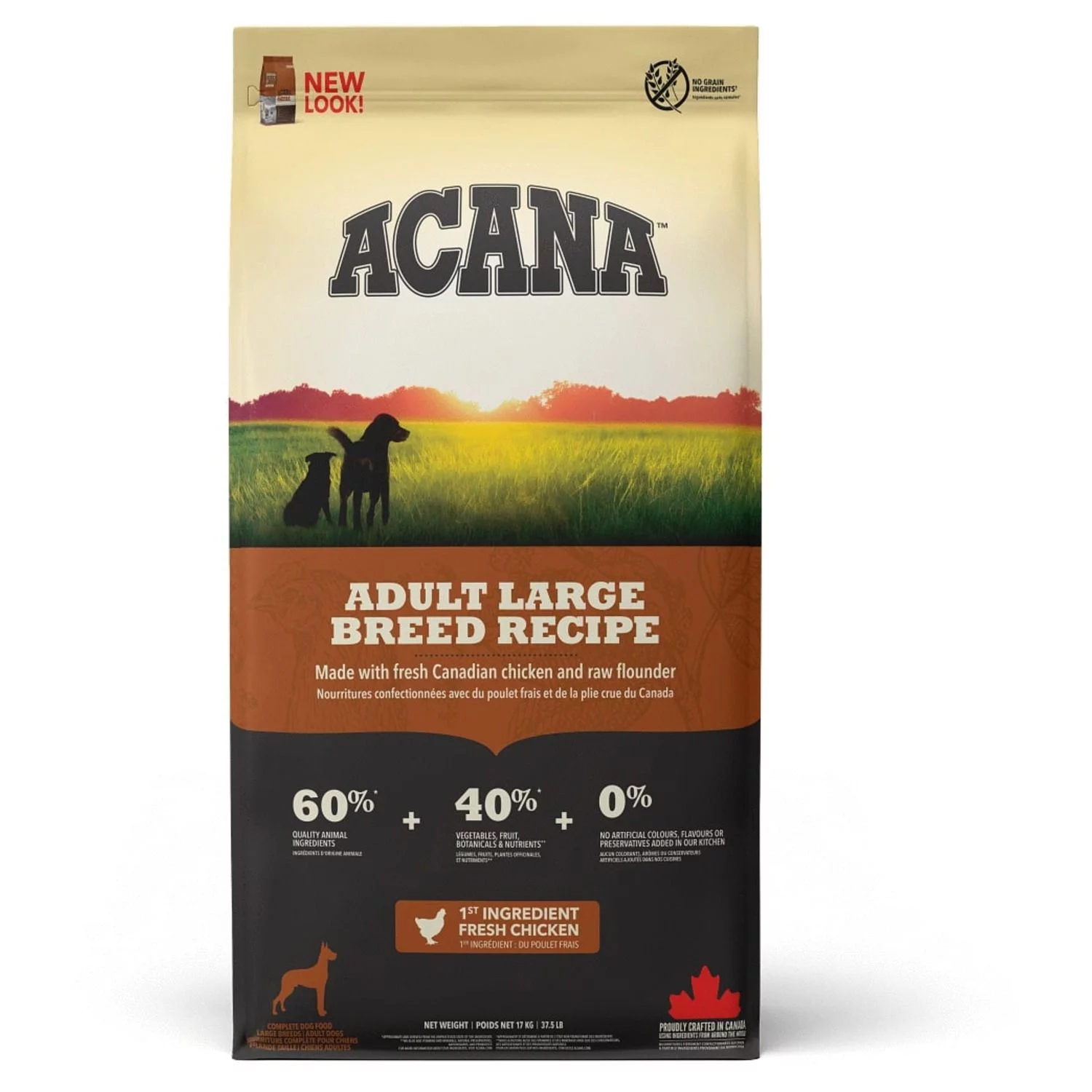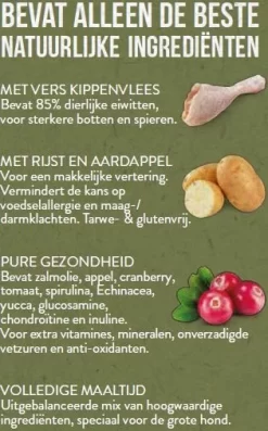 Jij wilt natuurlijk het beste geven aan je grote hond! grote honden hebben dan ook specifieke voedingswensen die zorgen voor een optimale fysieke conditie! Heritage Adult large breed van ACANA zit boordevol lokaal gefokte scharrelkip, scharreleieren, in het wild gevangen platvis en zongerijpt fruit en groenten. De ingrediënten worden bereid in de gecertificeerde keuken van ACANA in Canada met de beste ingrediënten van lokale boeren en telers. Zo krijgt je hond alles heeft wat hij nodig heeft om gezond en gelukkig te blijven!