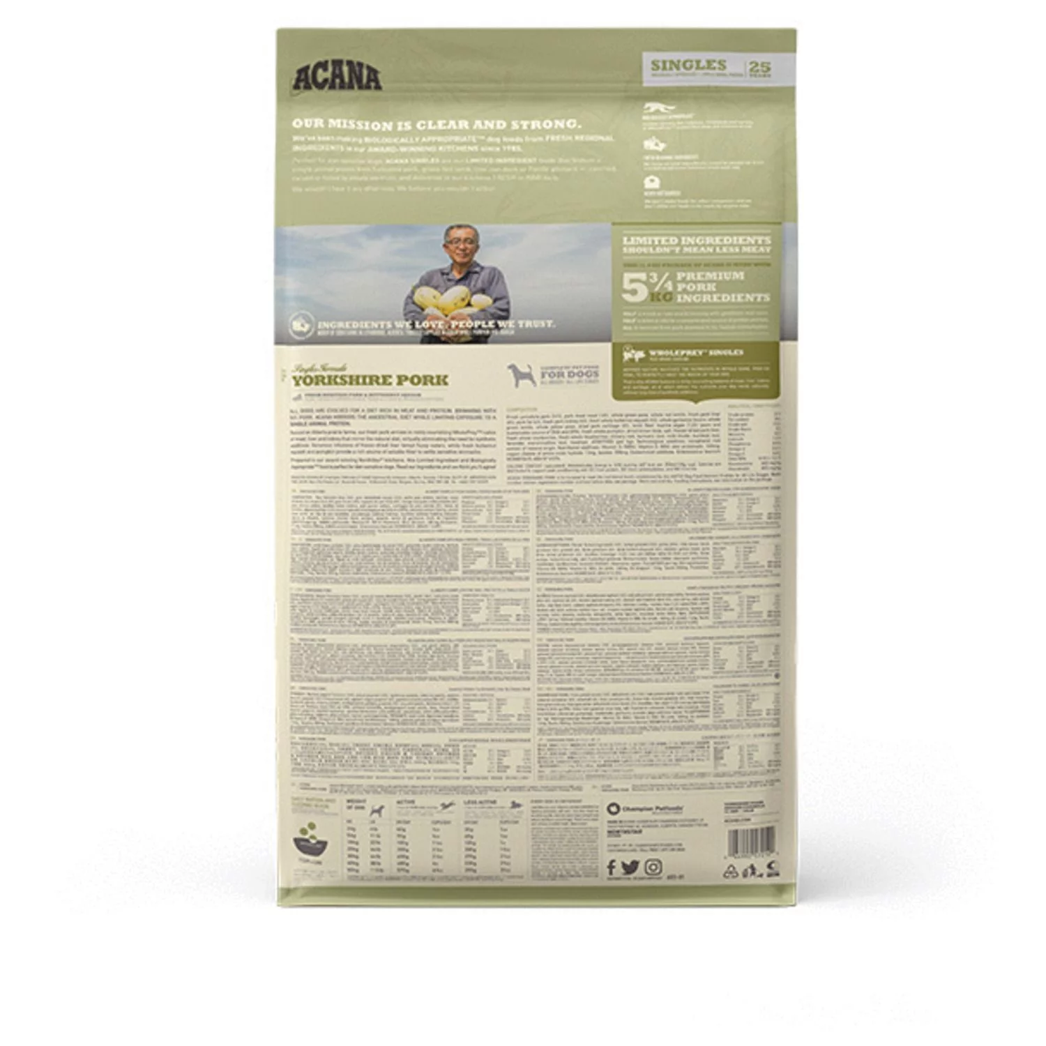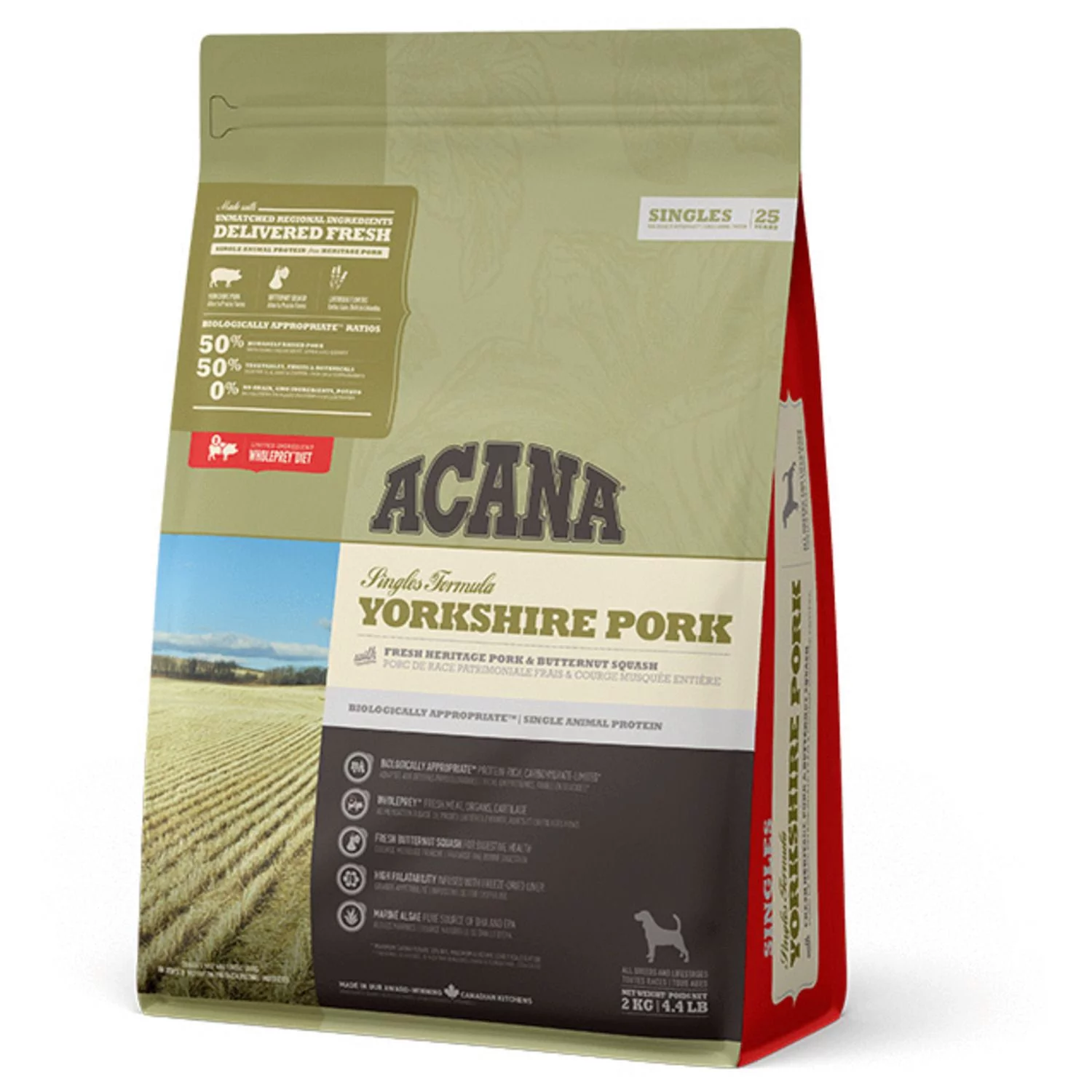 De voeding van ACANA is volgens het Biologically Appropriate-principe bereid en zit vol waardevolle voedingsstoffen voor een perfecte voeding van honden van alle rassen en leeftijden. ACANA Yorkshire pork bestaat uit 60% dierlijke ingrediënten en 40% plantaardige ingrediënten. Met maar 1 eiwitbron ideaal voor honden met een gevoelige maag en darm.