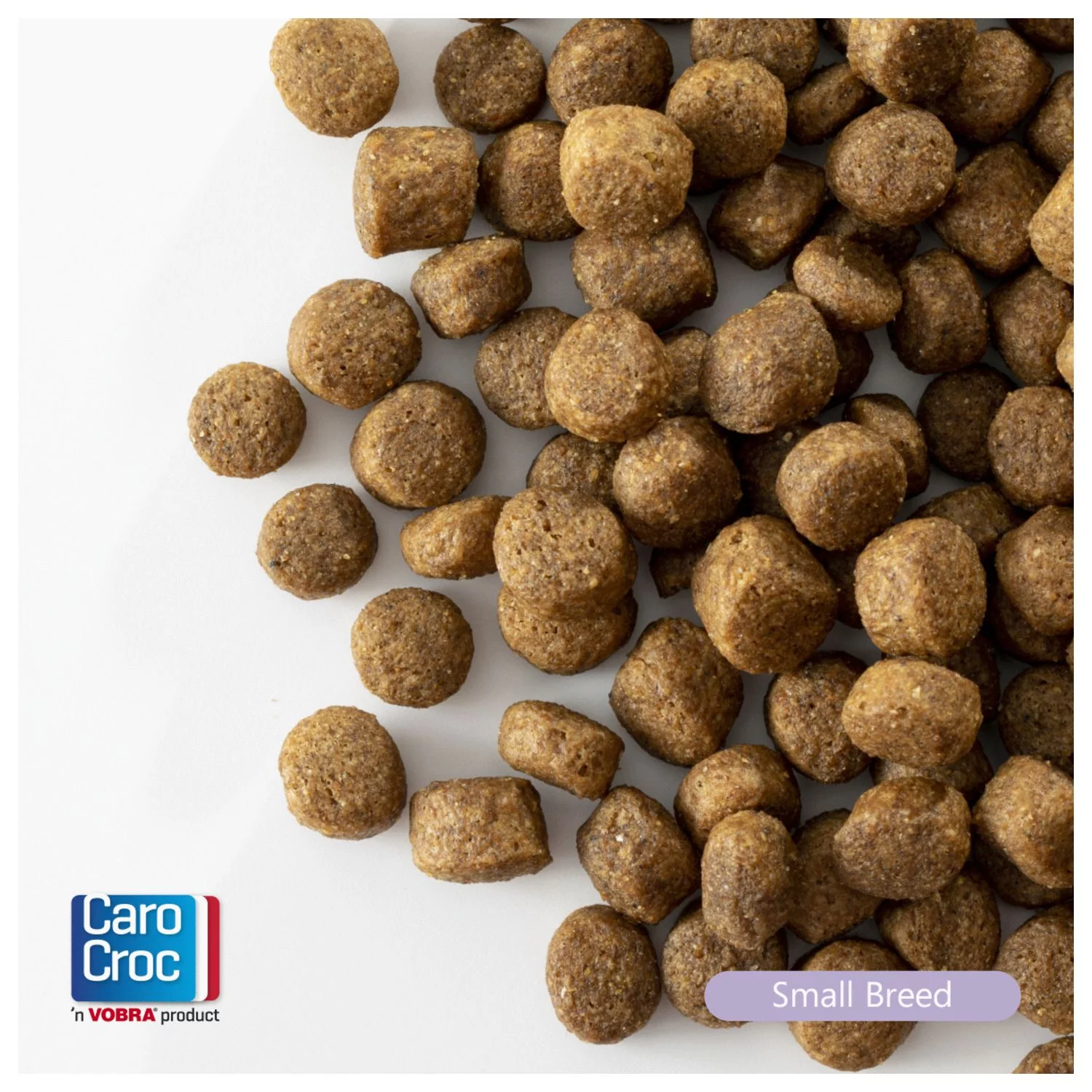 Onze kleinere viervoeters kunnen we niet volledig vergelijken met de grote viervoeters. Het gebit is in principe volledig hetzelfde, maar de ruimte daarin tegen niet! Doordat de tanden dichter op elkaar staan is er een grotere kans op het ontstaan van tandplak en tandsteen. Het is dus al van belang dat een voeding hier rekening mee houdt om een slechte adem en tandvleesontsteking te voorkomen. Ook hebben veel kleinere honden aanleg om gemakkelijk overgewicht te ontwikkelen. De CaroCroc Small Breed is specifiek samengesteld om deze specifieke behoeften te ondersteunen. De brokken stimuleren de vetafbraak, voorkomen tandplak en gaan cel veroudering tegen. Het brokje heeft een diameter van 11mm.