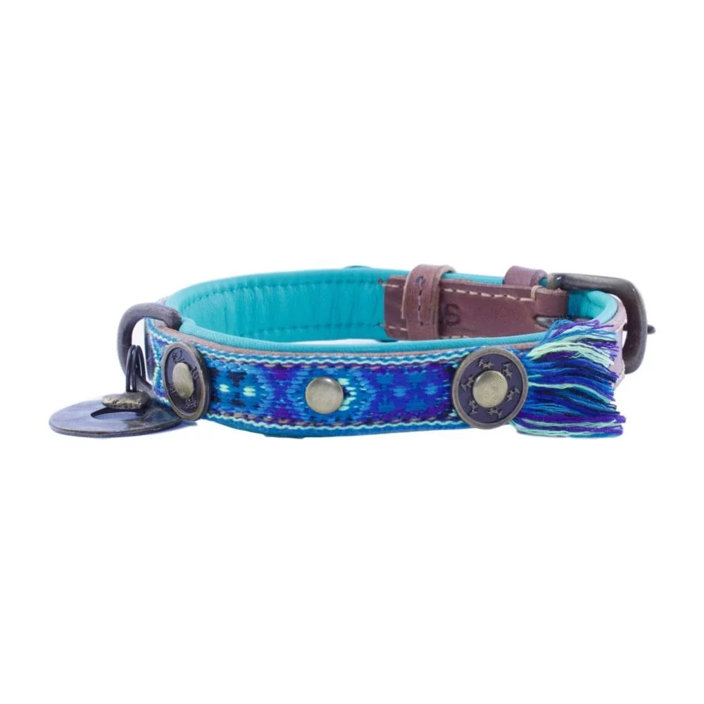 Wanneer je op pad gaat met je hond, wil je er natuurlijk wel flitsend uitzien. DWAM heeft een assortiment met prachtige riemen en halsbanden waarmee je hond er altijd stijlvol bij loopt. De Juan van Dog With A Mission is een handgemaakte, oersterke halsband voor je viervoeter. De Juan is gemaakt van stof en leer met turquoise en blauwe details voor een bohemian look. De halsband wordt afgemaakt met een bedeltje.