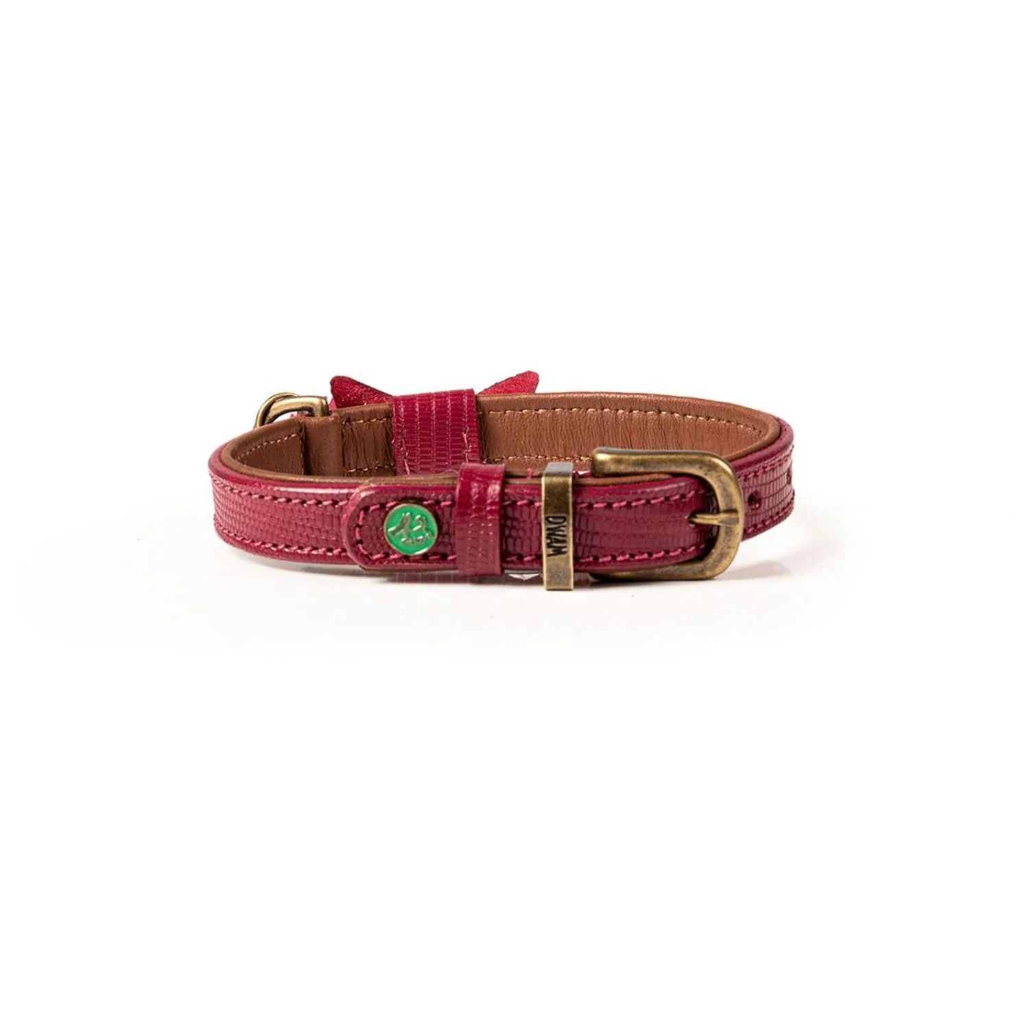 Wanneer je op pad gaat met je hond, wil je er natuurlijk wel flitsend uitzien. DWAM heeft een assortiment met prachtige riemen en halsbanden waarmee je hond er altijd stijlvol bij loopt. De Bonnie van Dog With A Mission is een handgemaakte, oersterke halsband voor je viervoeter. De Bonnie is gemaakt van bordeauxrood leer met voorop een verwijderbare, schattige strik. De halsband wordt afgemaakt met een bedeltje en een hagedissenprint.