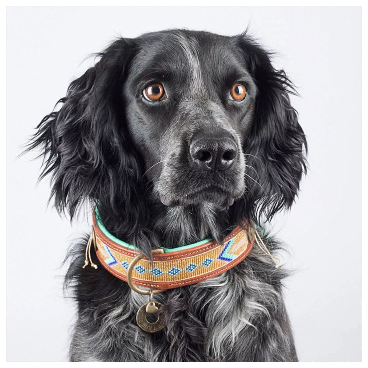Wanneer je op pad gaat met je hond, wil je er natuurlijk wel flitsend uitzien. DWAM heeft een assortiment met prachtige riemen en halsbanden waarmee je hond er altijd stijlvol bij loopt. De Indi Moon van Dog With A Mission is een handgemaakte, oersterke halsband voor je viervoeter. De Indi Moon is gemaakt van leer met in combinatie met prachtige goud/turquoise kralen. De halsband wordt afgemaakt met een bedeltje.