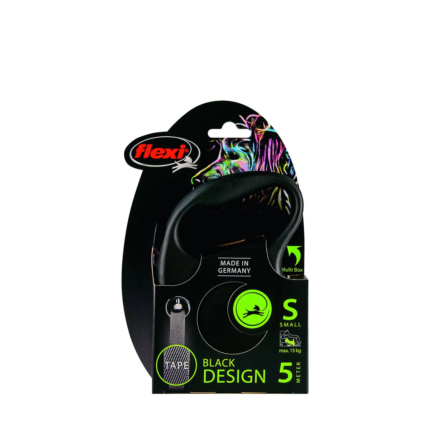 Het is mogelijk om de Black Design S Tape uit te breiden met de Flexi Multi Box (poepzakjes- of snackhouder). De lijn is verkrijgbaar in verschillende maten, afhankelijk van het gewicht van je hond. De Black Design-lijn bevat zwarte rollijnen met opvallende, gekleurde accenten.