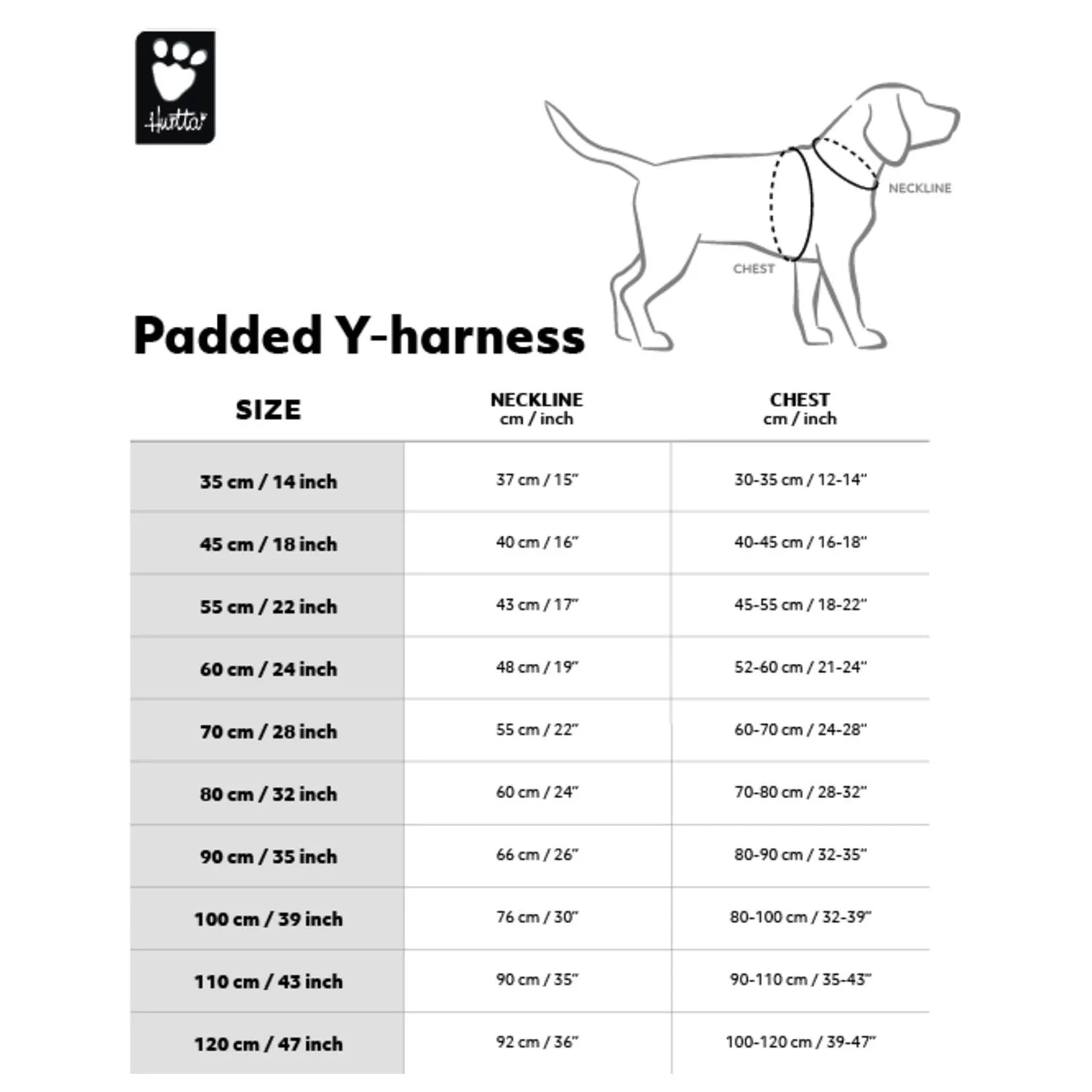Het Hurtta Padded Tuig Y-Model is verkrijgbaar in verschillende maten.