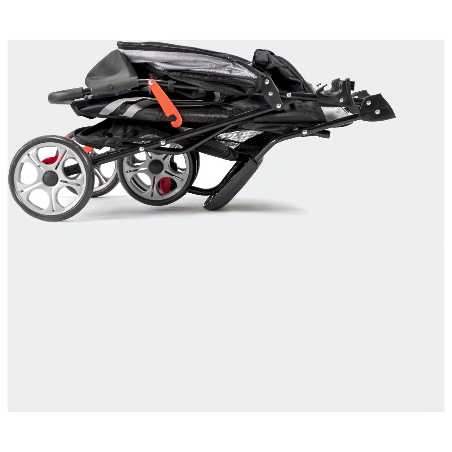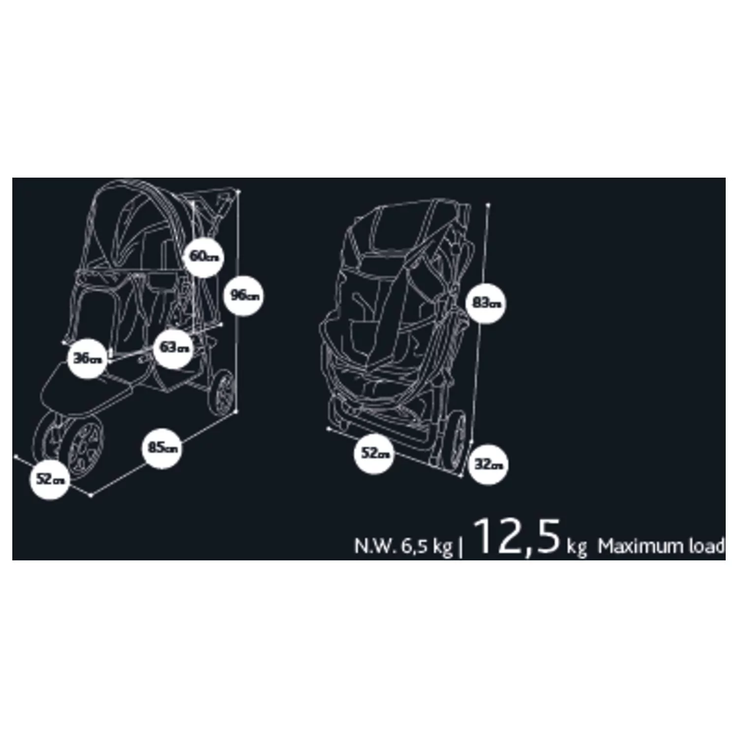 De buggy kan aan de voorzijde open om je hond in de buggy te tillen. De voorflap kan je omhoog klappen onder de kap van de kap (zo zit het niet in de weg van je hond) om je hond de ruimte te geven om om zich heen te kijken. Of je ritst deze flap dicht voor extra veiligheid onderweg. Het zitgedeelte bevat 2 aanleglijnen. De kar heeft voldoende ventliatiegaas zodat je hond genoeg lucht krijgt, ook met de ritsen dicht.