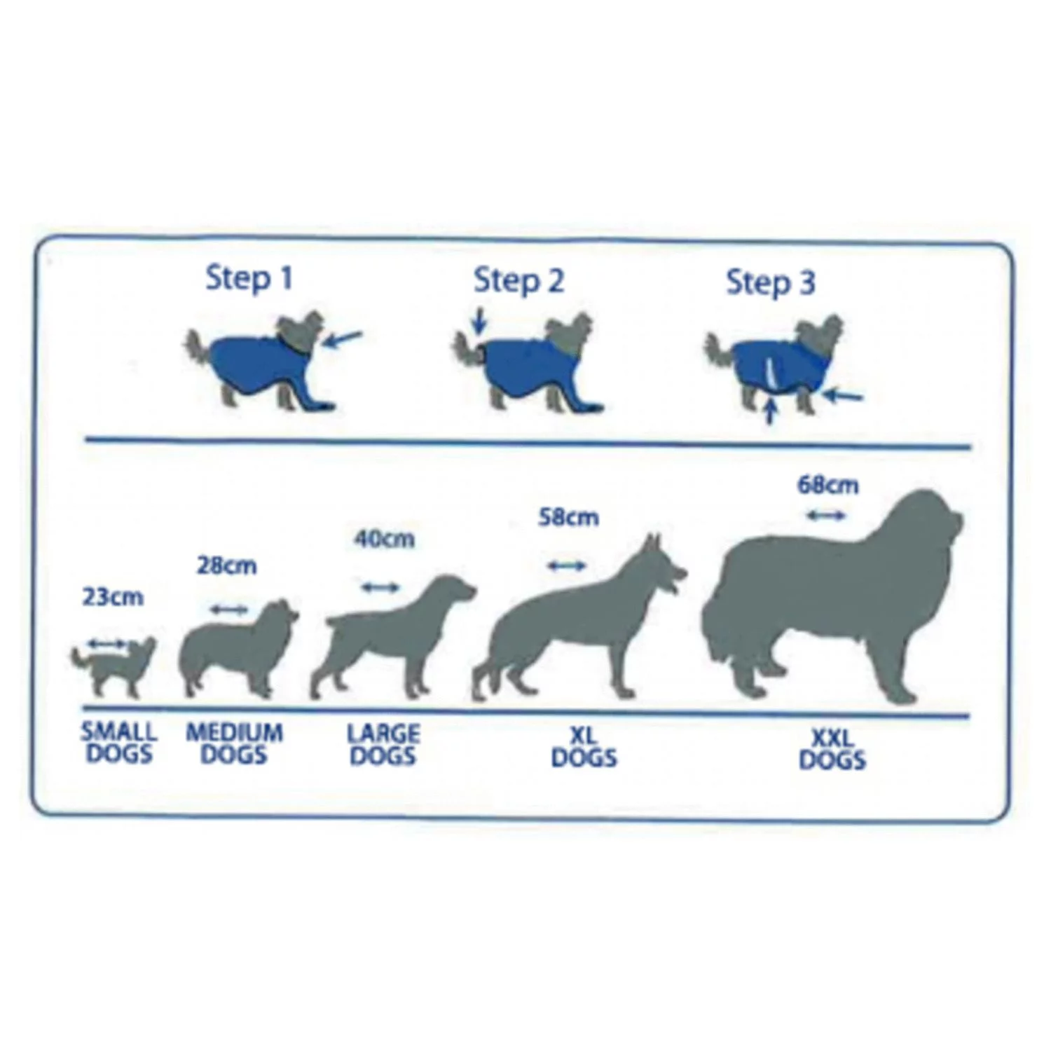 De Badjas is blauw van kleur en is verkrijgbaar in verschillende maten; hierbij wordt uitgegaan van de ruglengte van je hond: