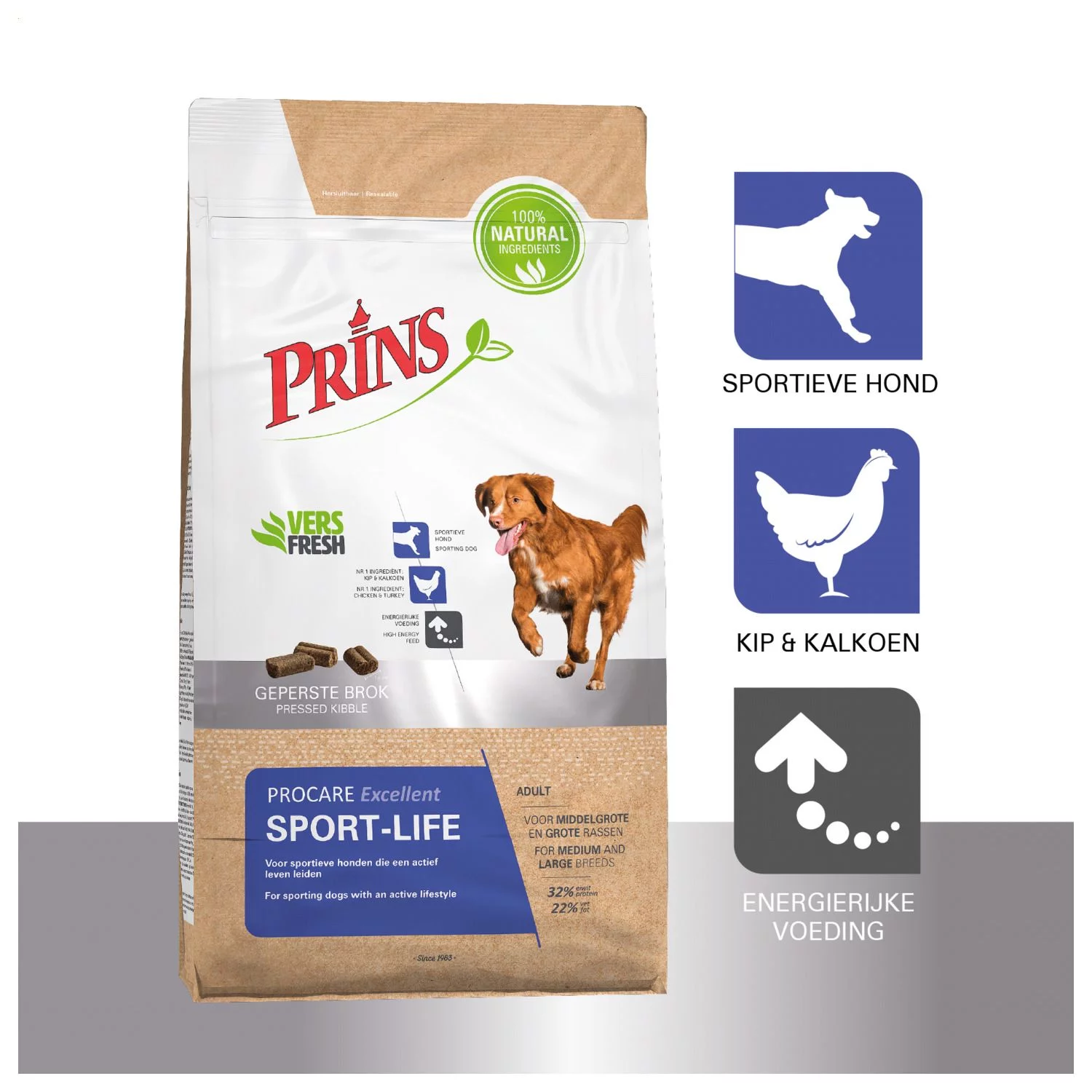 Voor sportieve honden is het ontzettend belangrijk dat ze een voeding krijgen die voor genoeg energie zorgt. Prins ProCare Sport-Life Excellent is een 100% natuurlijke, geperste brokvoeding voor volwassen honden van (middel)grote rassen die een actief leven leiden.