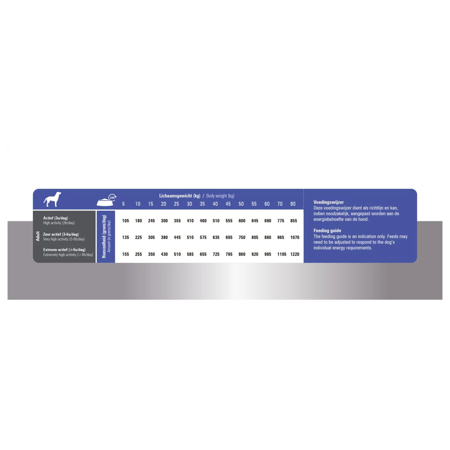 Deze brok is ideaal voor sportieve honden die naast hun gebruikelijke dagelijkse beweging, ook een paar keer per week topprestaties moeten leveren. Denk aan honden die aan canicross of agility doen. Zo bevat de voeding een hoger vet- en eiwitgehalte om aan de behoefte van je hond te voldoen, daarnaast bevordert L-carnitine een optimale vetverbranding. Om de spieren te ondersteunen zijn kip en kalkoen toegevoegd, beide rijk aan eiwitten die bijdragen aan de groei en instandhouding van de spiermassa. Ook zorgen de eiwitten voor een goede conditie van de spieren.
