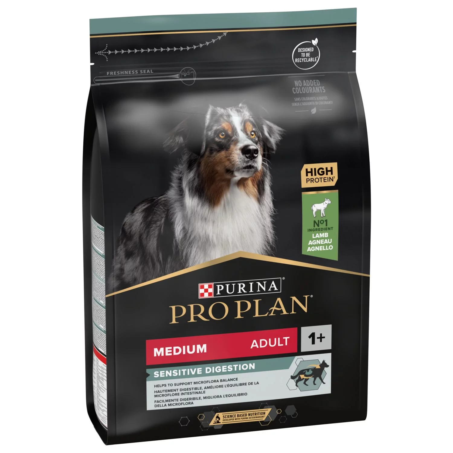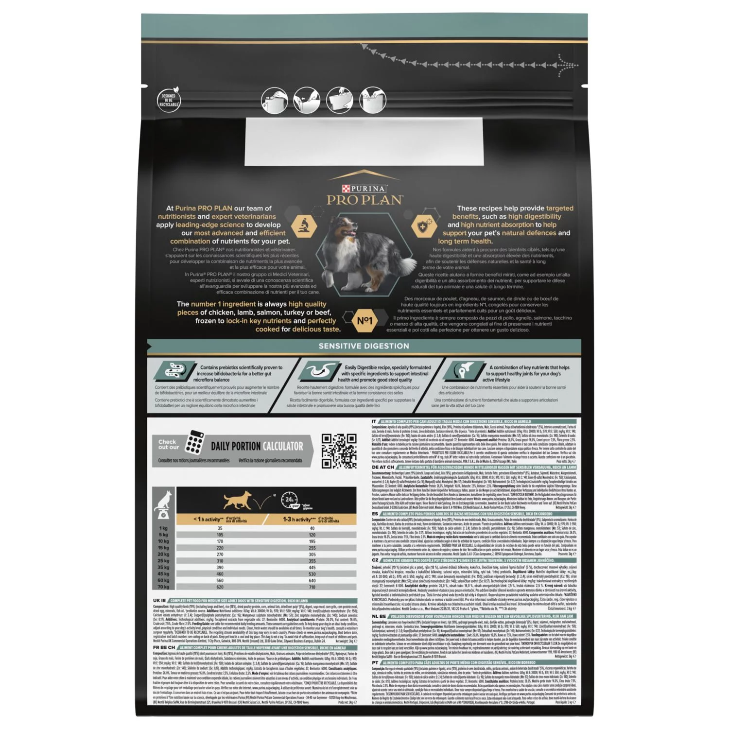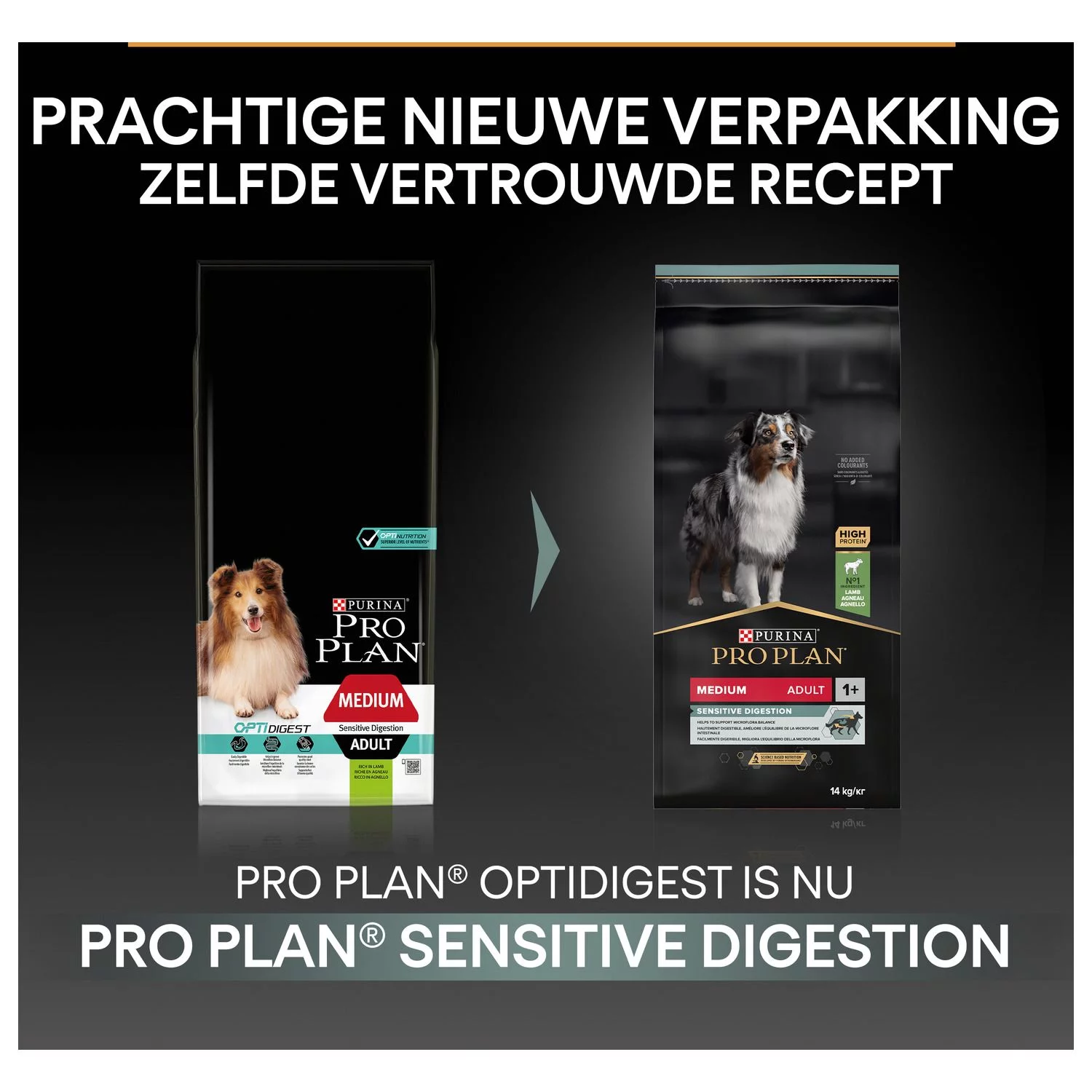 Purina Pro Plan Dog Sensitive Digestion is verkrijgbaar in 3 kg en 14 kg.