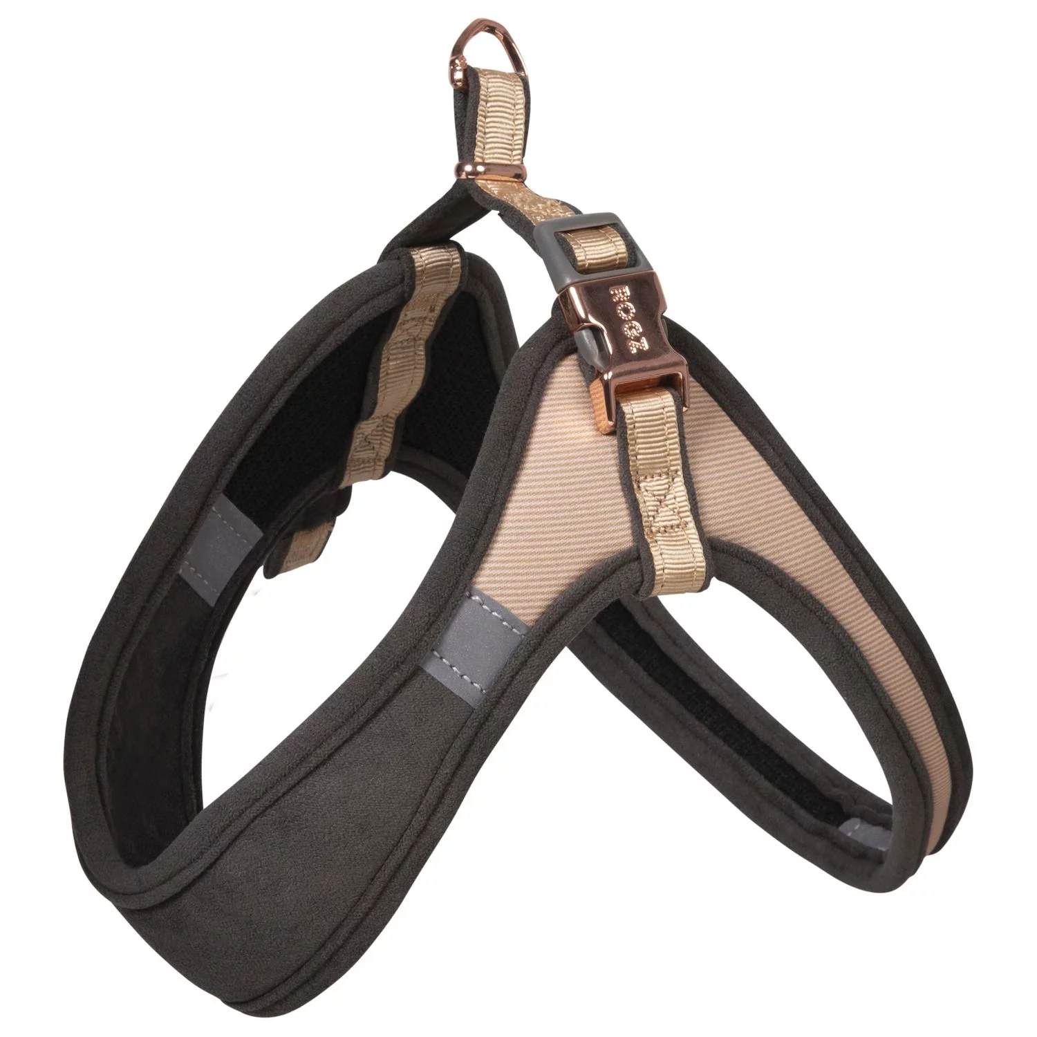 Het tuig heeft een zeer goede pasvorm dankzij onder andere de zachte padded-cushion voering die zorgt voor extra comfort en ondersteuning, zo zijn de gewrichten van je hond volledig vrij om te bewegen. De harde onderdelen hebben een ronde vorm, zo vormen ze mee met het lichaam en heeft het tuig een optimale pasvorm. Het tuig heeft zachte pasteltinten met rosé gouden details, die nooit uit de mode raken.