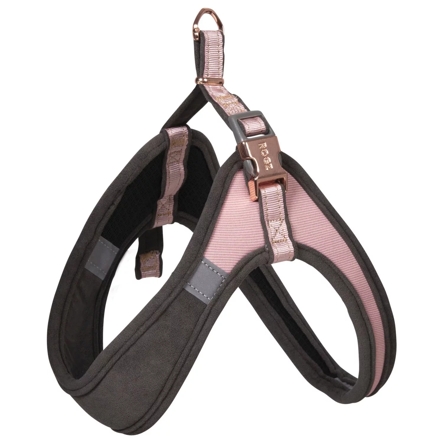 Het tuig heeft een zeer goede pasvorm dankzij onder andere de zachte padded-cushion voering die zorgt voor extra comfort en ondersteuning, zo zijn de gewrichten van je hond volledig vrij om te bewegen. De harde onderdelen hebben een ronde vorm, zo vormen ze mee met het lichaam en heeft het tuig een optimale pasvorm. Het tuig heeft zachte pasteltinten met rosé gouden details, die nooit uit de mode raken.