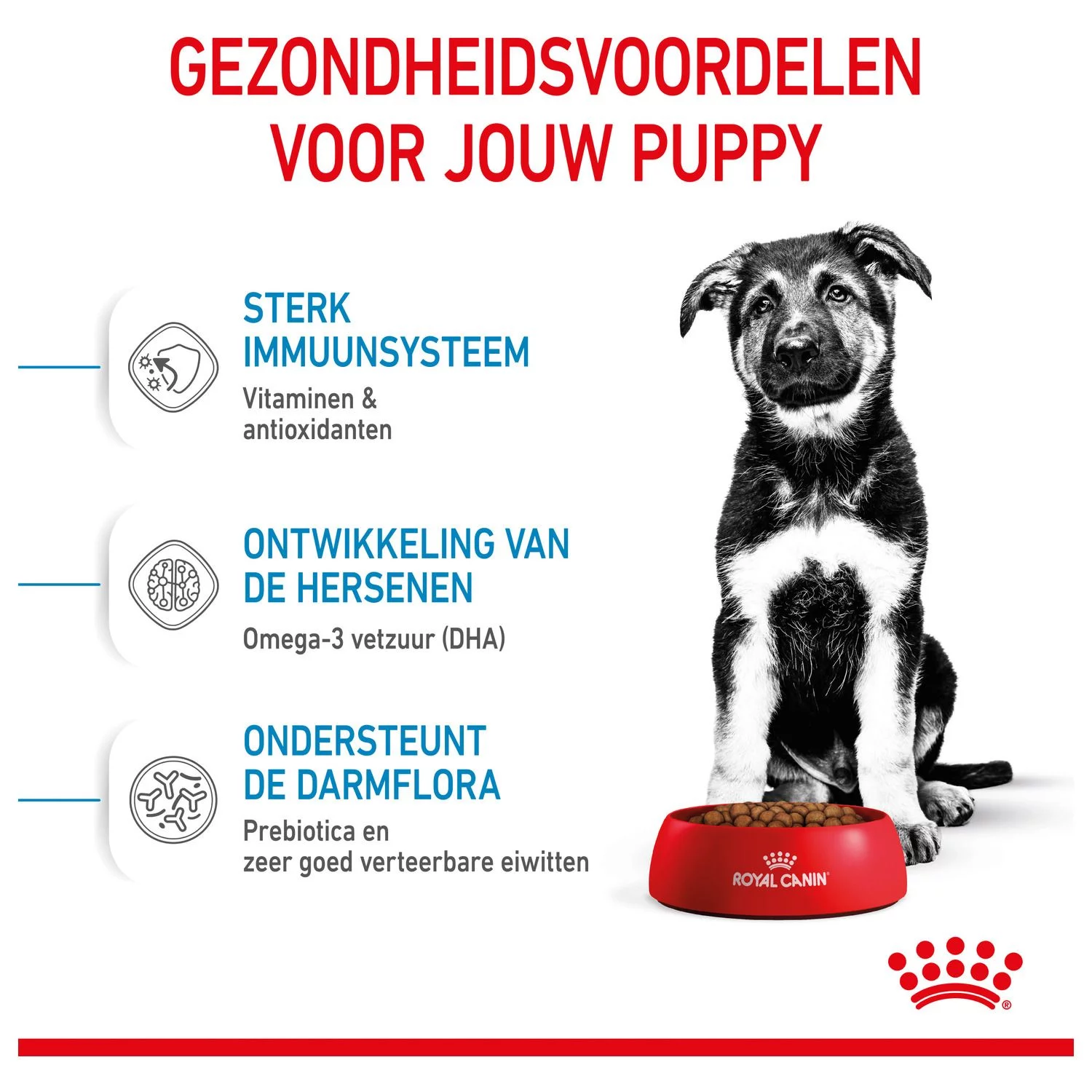 Puppyvoeding heeft andere voedingsstoffen dan brokken voor volwassen honden. Zo hebben puppy’s van grote rassen voldoende calorieën nodig voor de ontwikkeling van het skelet, zenuwstelsel en de zintuigen. Hierbij moet men goed letten op de calcium- en vitaminegehaltes zodat bot- en gewrichtsproblemen worden voorkomen. Uiteraard houdt Royal Canin Giant Puppy met al deze zaken rekening.