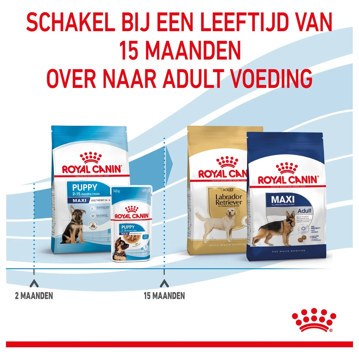 - Voor puppy’s van grote rassen van 2 tot 15 maanden oud
