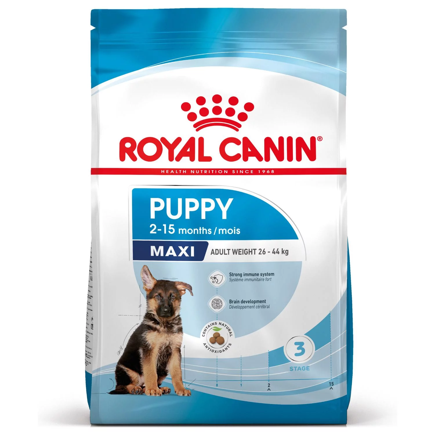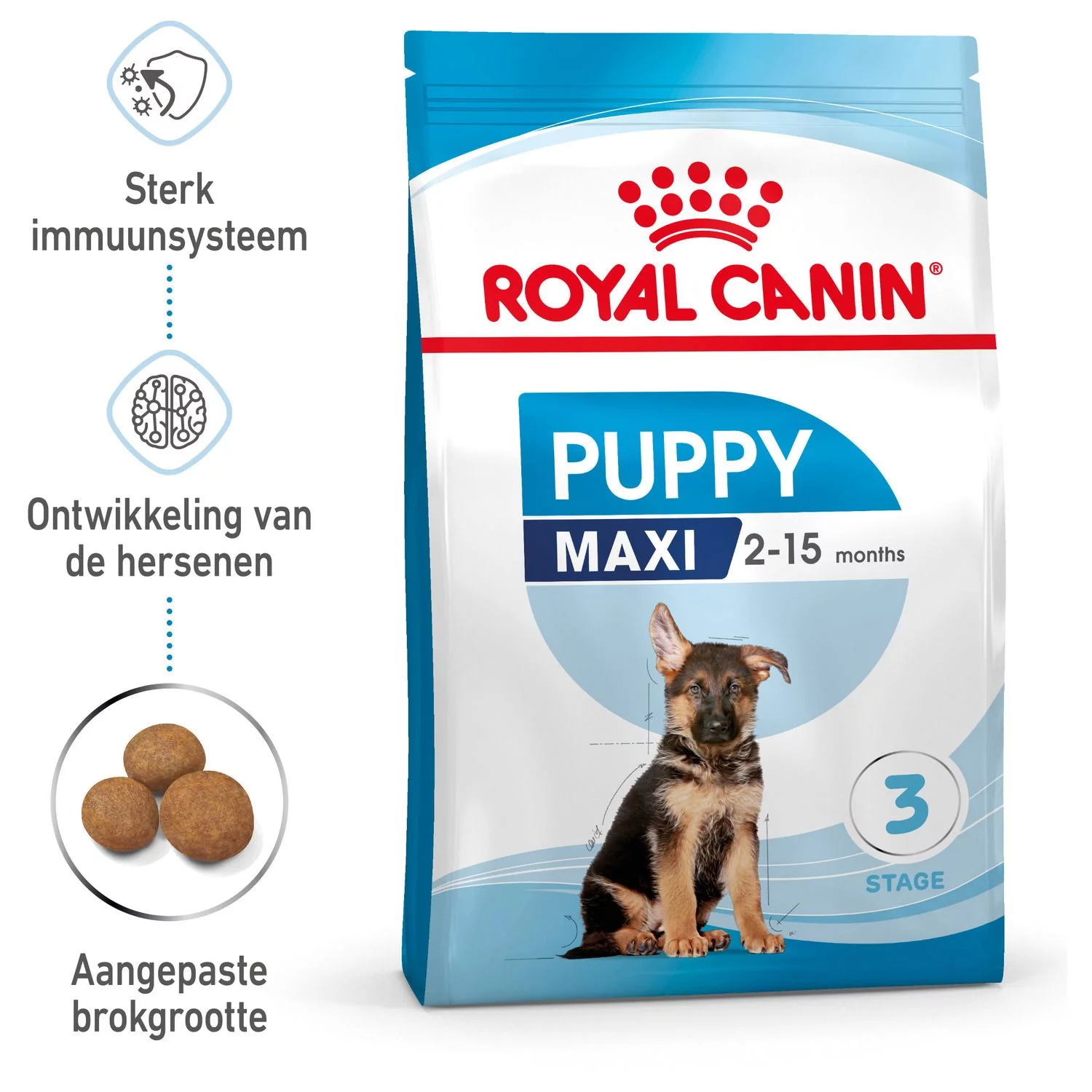 Royal Canin Maxi Puppy is speciaal ontwikkeld met de voedingsbehoeften van een pup van een groot ras (22 tot 44 kg wanneer volwassen) in het achterhoofd. De brokken zijn geschikt voor puppy’s van 2 tot 15 maanden oud.