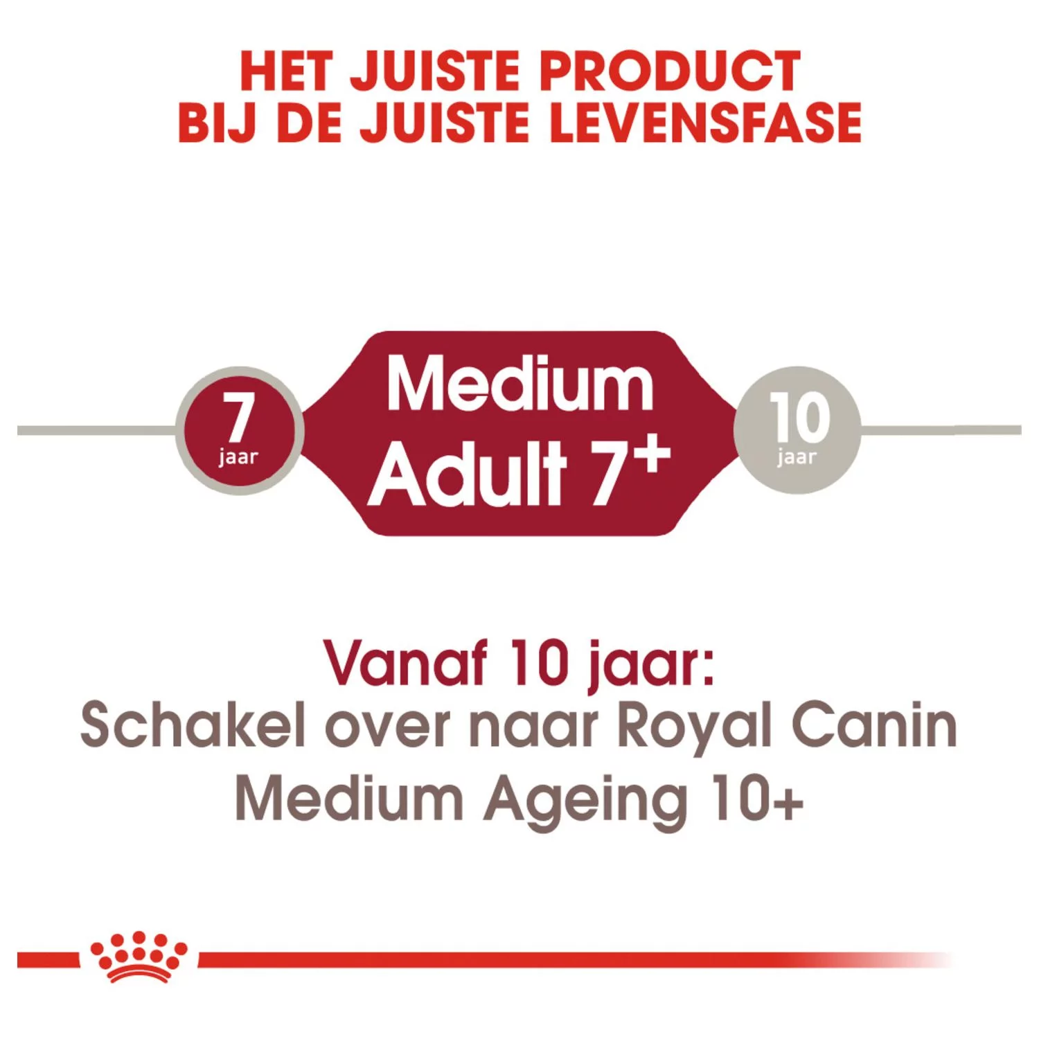 Royal Canin Medium Adult 7+ is verkrijgbaar in 4 kg, 10 kg en 15 kg.