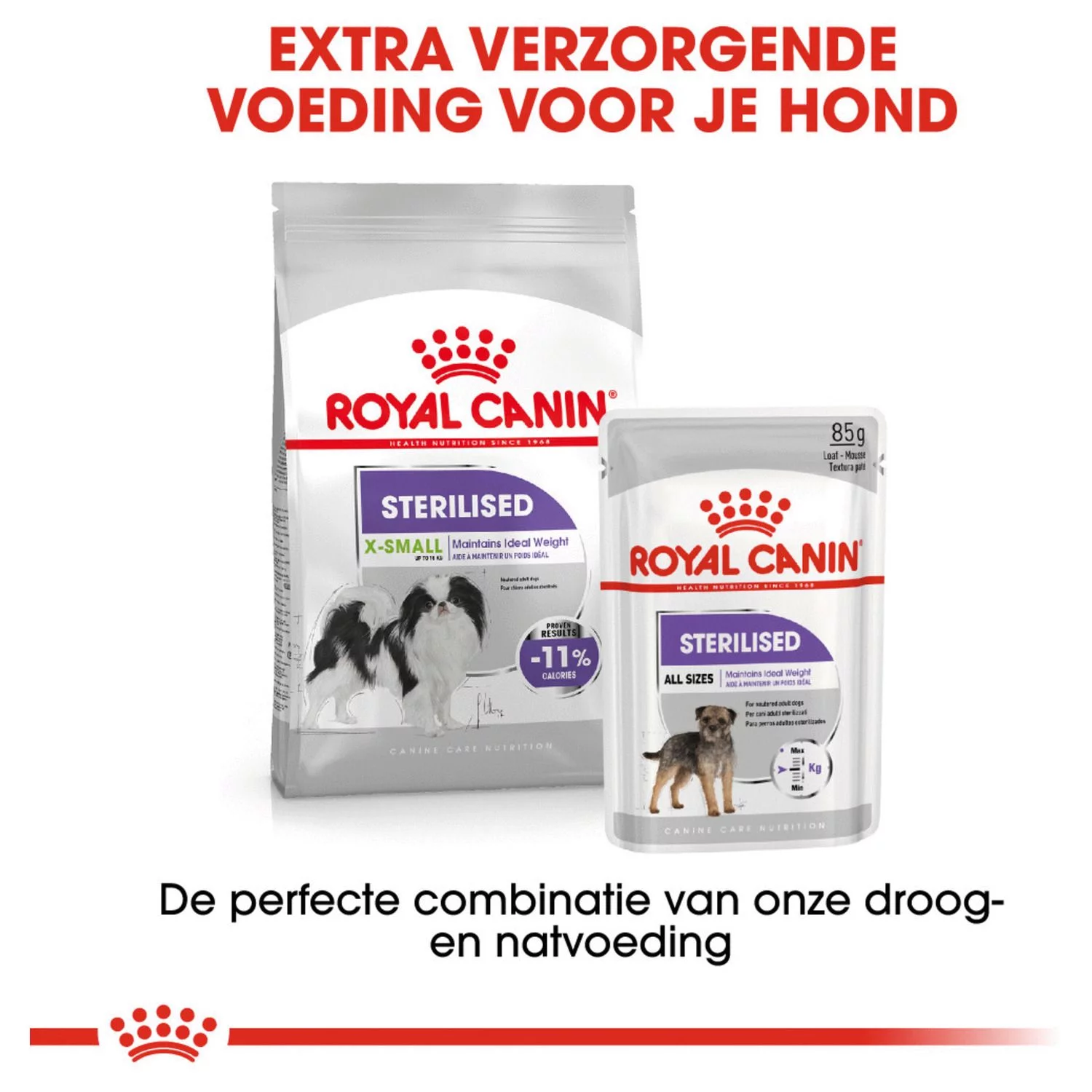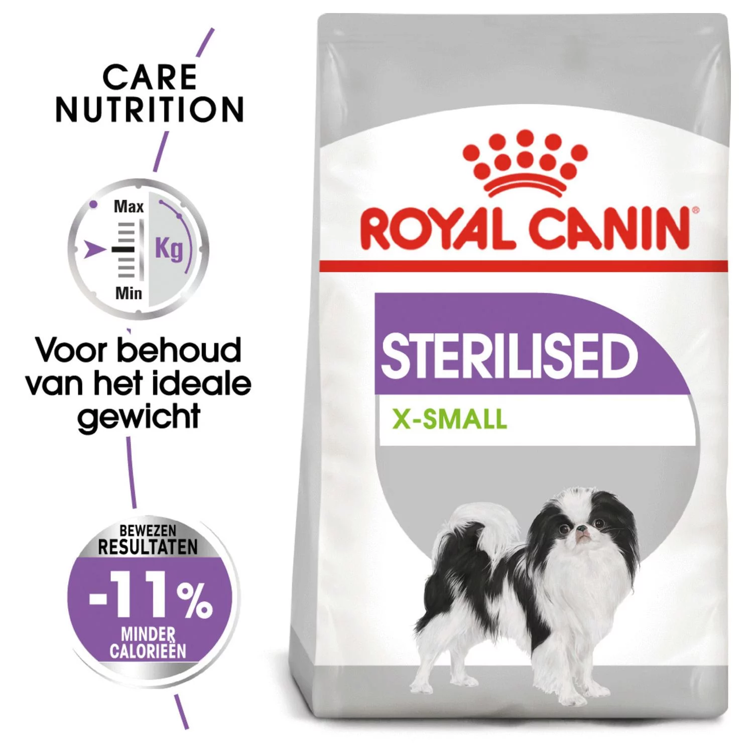 Sterilised X-Small van Royal Canin is geschikt voor gecastreerde of gesteriliseerde honden met een lichaamsgewicht van maximaal 4 kilogram en deze hoogkwalitatieve complete voeding bevredigt de eetlust van je hond en helpt hem zijn ideale gewicht te behouden.