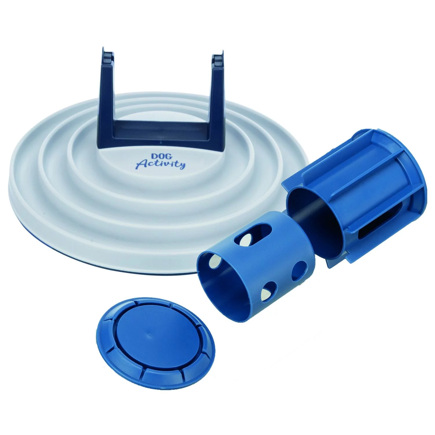 De Dog Activity Roller Bowl is wit met blauw van kleur en is 22 x 33 x 18 cm groot.
