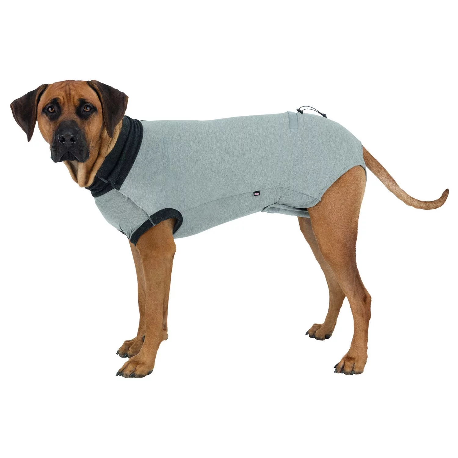 Het operatiehesje is gemaakt van een lichte, ademingsactieve en elastische stof. Je kan het hesje goed op maat maken dankzij de klittenbandstrook, drukknoopbiezen en het trekkoord. Dankzij een opening in de rug kan je je hond nog gewoon aanlijnen.