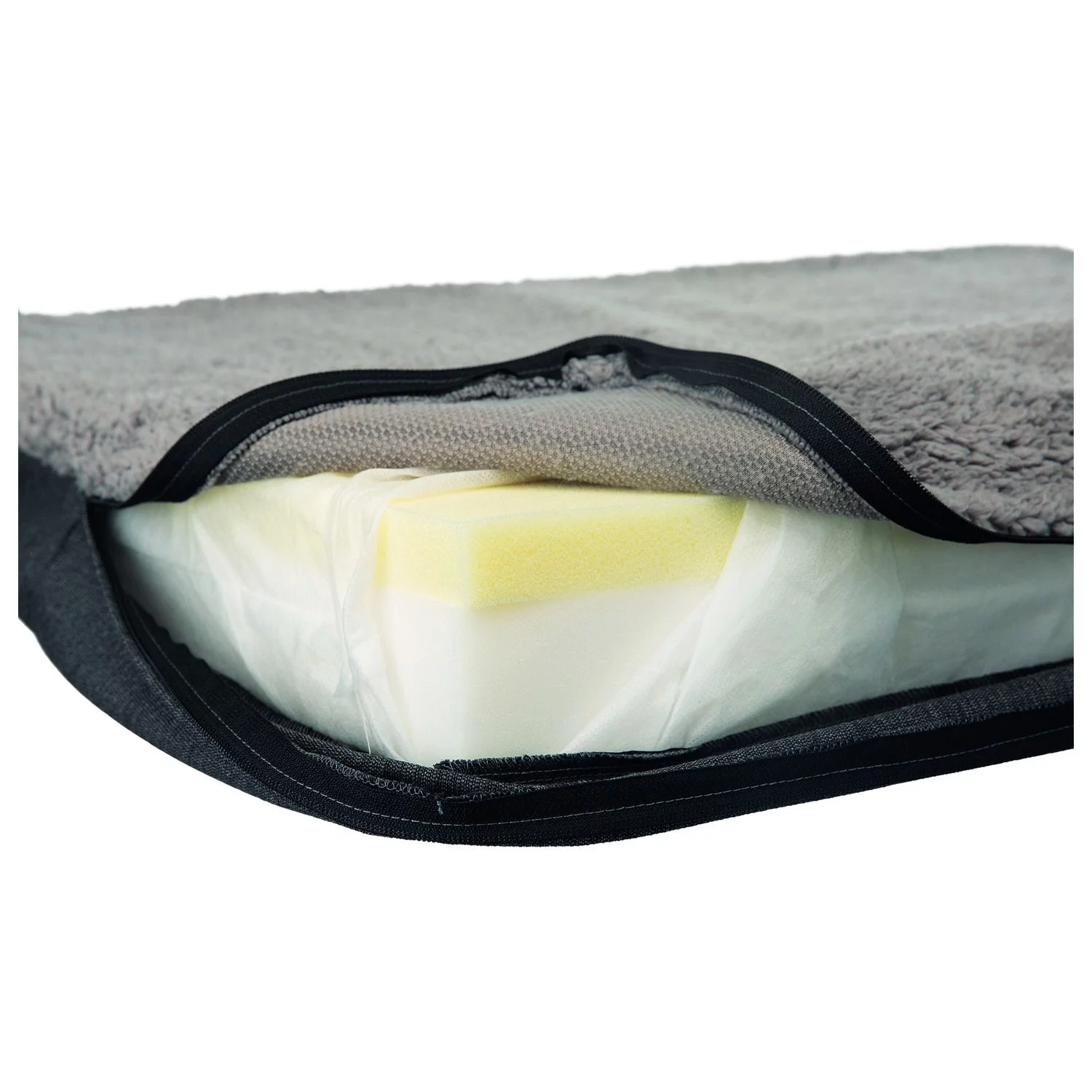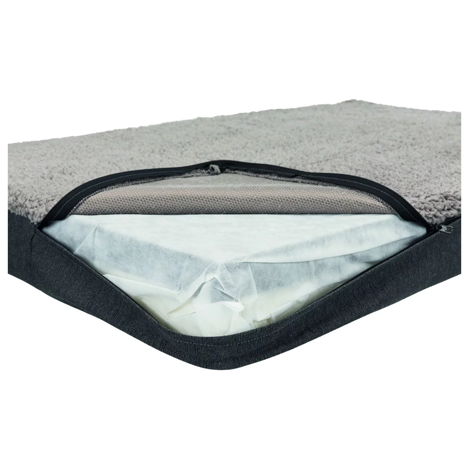 Het matras is gemaakt van hoogwaardig pluche met een robuuste geweven stof en een polyester bekleding. De onderkant is slipvast zodat het matras goed op z’n plek blijft liggen. Het matras bestaat uit twee lagen, namelijk een laag met PU-comfortschuim (zeer vormvast, hoge veerkracht voorkomt kuilvorming, goede warmte-isolatie, open celstructuur en ademingsactie) en een laag met visco-elastisch schuim (zeer hoogwaardig viscoschuim, past zich aan de lichaamsvorm- en temperatuur aan, ondersteunt wervelkolom en gewrichten en is drukpuntverlagend, zeer vormvast). Het kussen zal elke keer weer zijn oorspronkelijk vorm aannemen door het memory-effect.