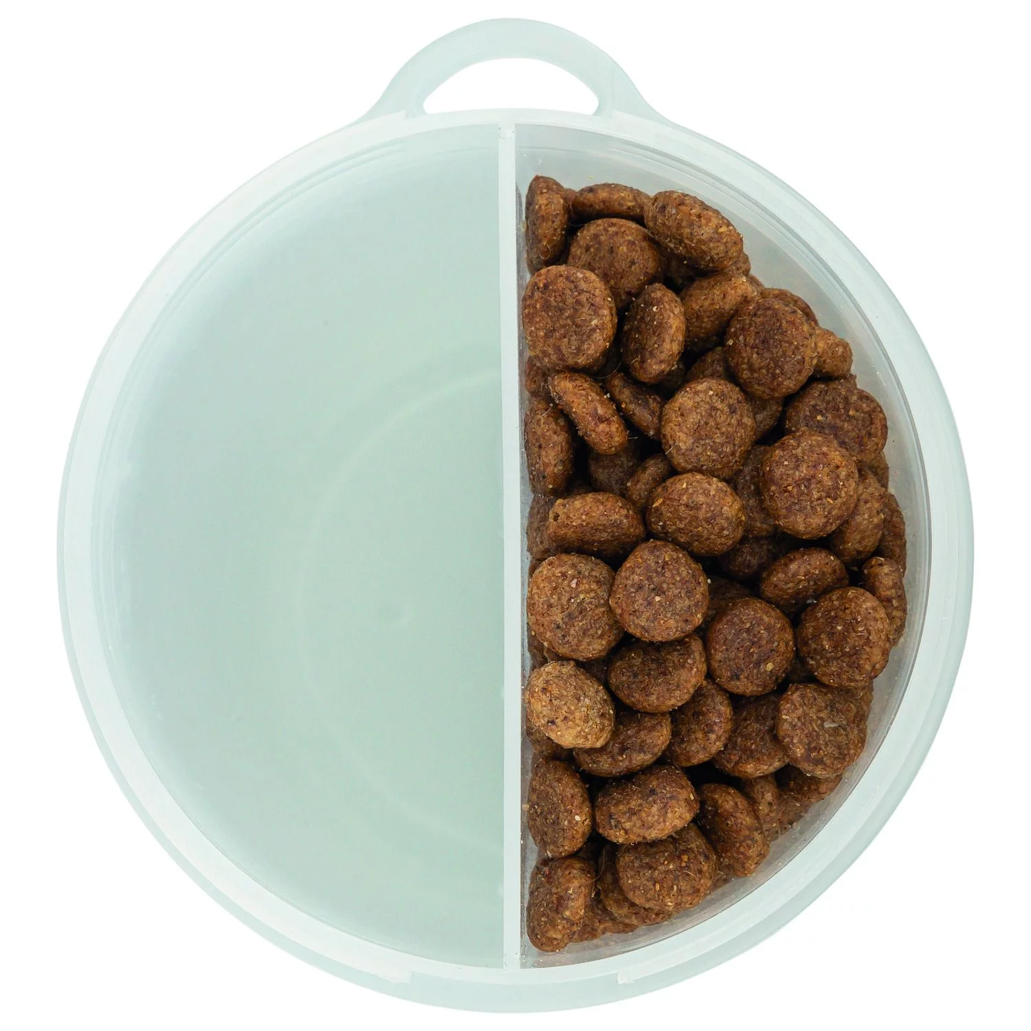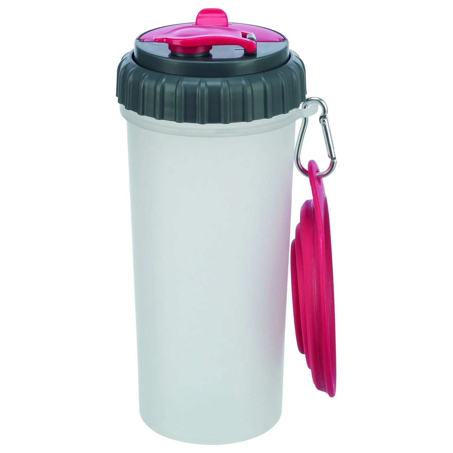 2 gescheiden kamers met waterdicht deksel , 2 openingen in het deksel voor een afzonderlijk gebruik van de kamers , met karabijnhaak en inclusief reisbak uit siliconen , kunststof/siliconen