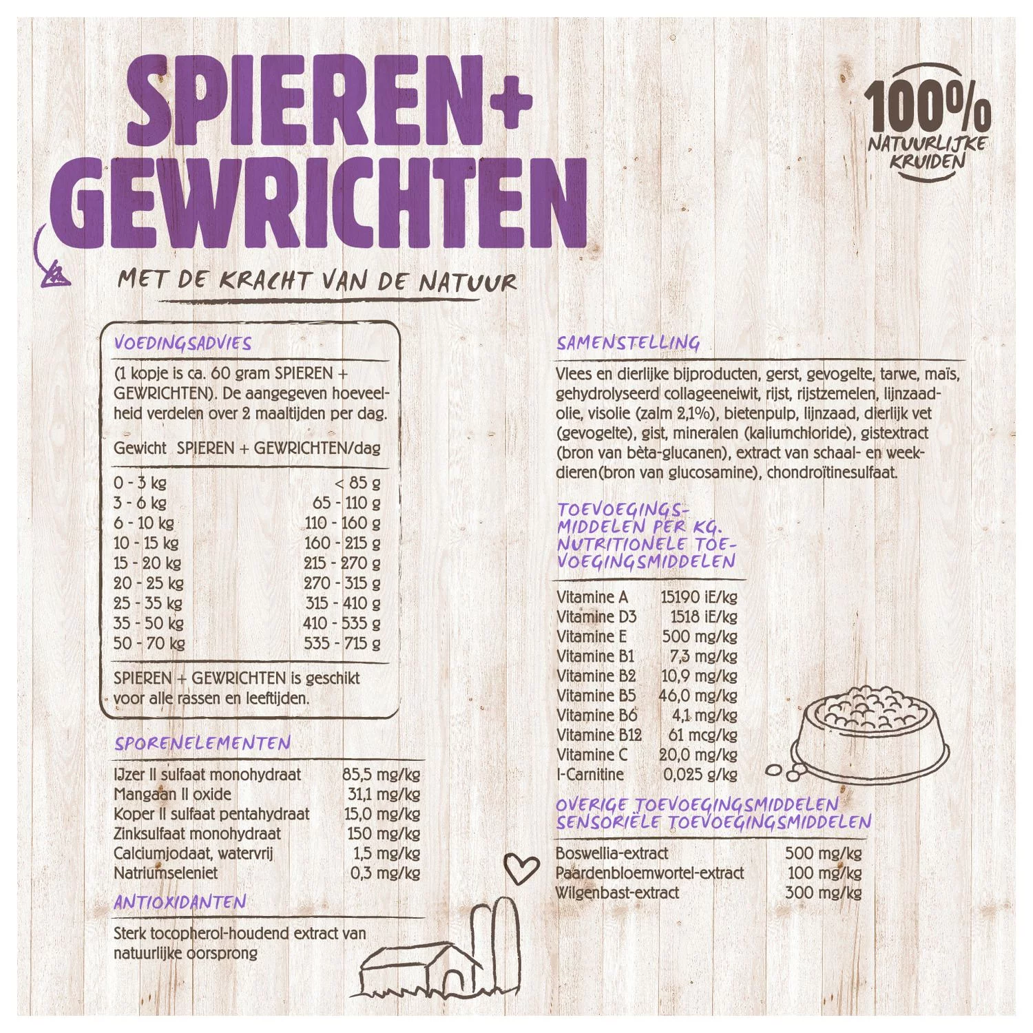 SPIEREN + GEWRICHTEN hondenvoeding verkrijgbaar in 1,5 kg, 5 kg en 12 kg.