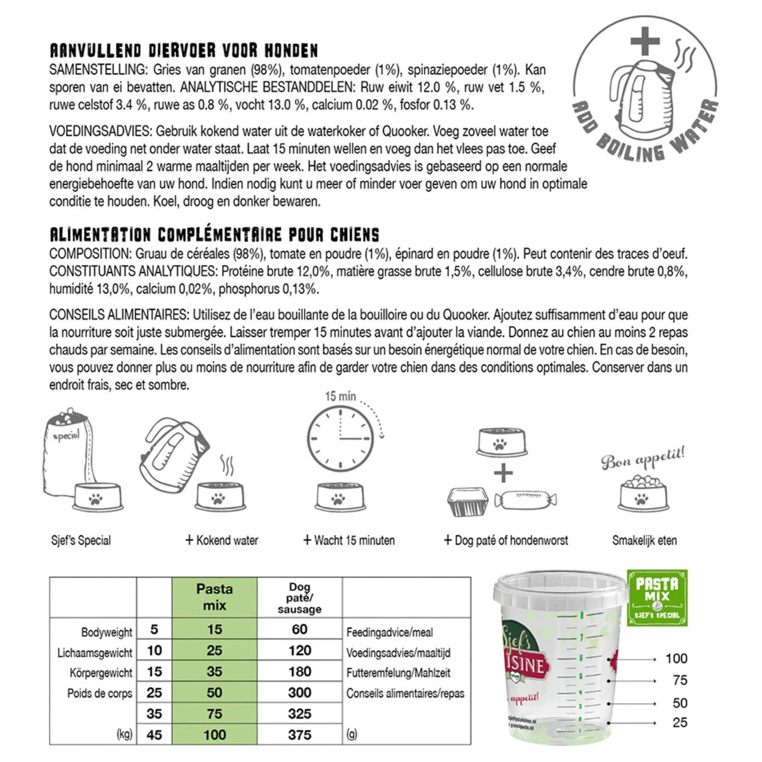 Deze variant met pasta is rijk aan vitaminen en mineralen en is zeer licht verteerbaar. De pastamix is zeer geschikt voor actieve honden en is een goede aanvullende bron van koolhydraten, ideaal voor onder andere de spieropbouw. In deze Sjef’s Special zitten ingrediënten zoals spinazie (voor het immuunsysteem) en tomaat (voor de spijsvertering). De mix bevat geen toegevoegde geur-, kleur- en smaakstoffen of zout. Een gezonde keuze voor je viervoeter!