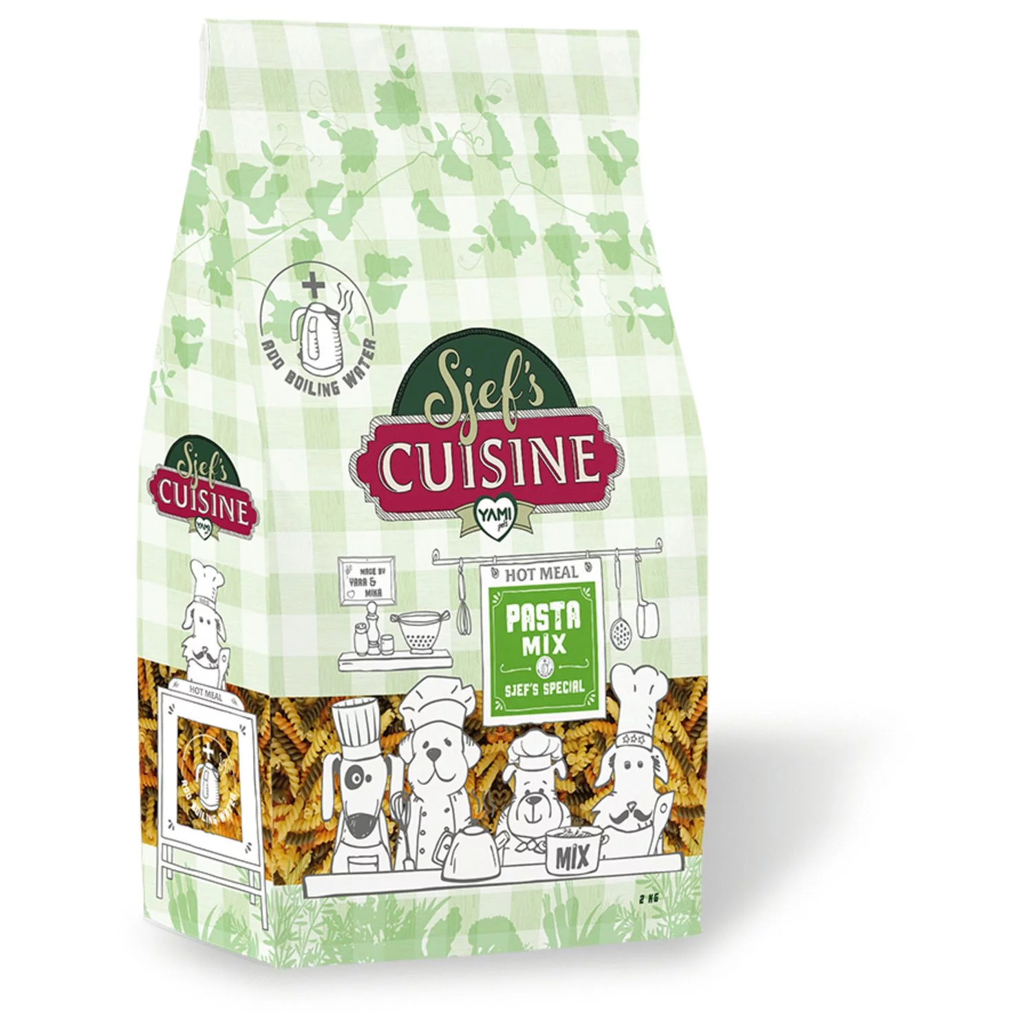 Yamipets adviseert om hun Sjef’s Cuisine-brokken minimaal 2 keer per week af te wisselen met een warme maaltijd uit de Sjef’s Special-lijn, zoals deze Sjef’s Special Pasta Mix. Aan deze maaltijd voeg je warm water toe om zo een heerlijke rijst-, pasta- of aardappelvlokkenmix te creëren. Combineer deze maaltijd vervolgens met een lekkere worst of paté en je hebt een super gezonde maaltijd boordevol groente, vocht en natuurlijk vlees!